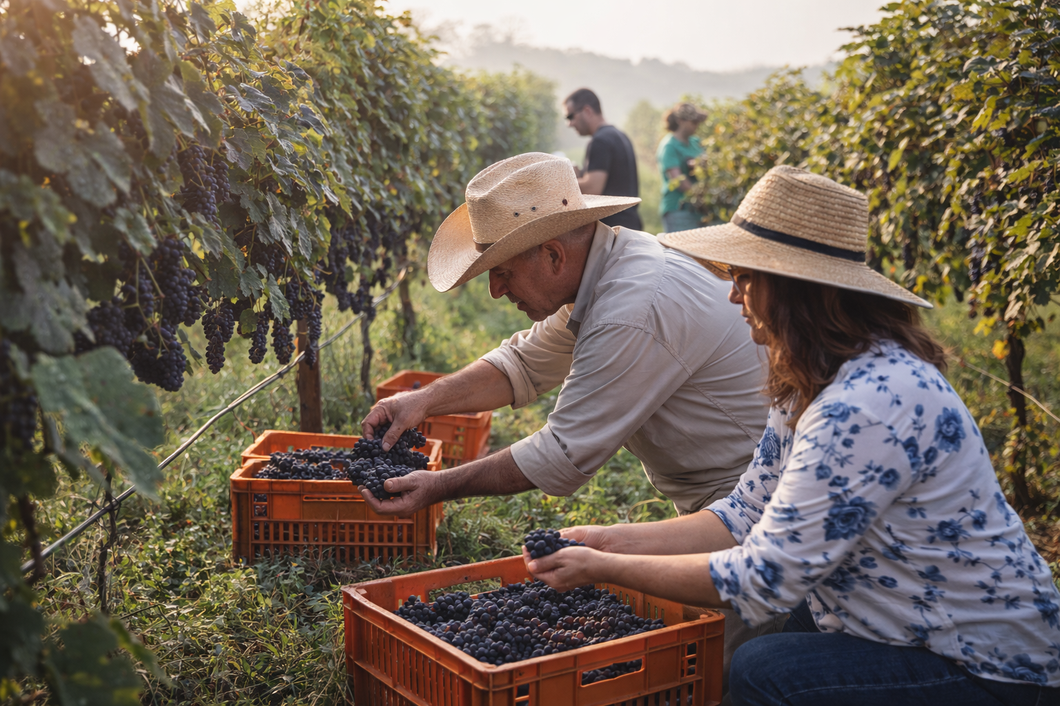 La cosecha se realiza en las primeras horas de la mañana para aprovechar las temperaturas más frescas y preservar las características aromáticas de la uva. Los racimos son cuidadosamente depositados en cajas pequeñas para evitar que se aplasten durante el transporte hasta nuestra bodega.